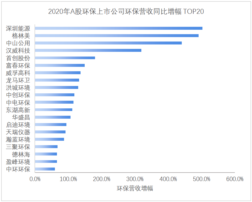 A股環(huán)保上市公司環(huán)保營收方面:2020年,150家上市公司環(huán)保營收總額3341.4億元,同比增長25.3%。其中,101家(占比67.3%)環(huán)保營收實(shí)現(xiàn)同比增長,最高增幅約達(dá)1171.1%;49家(占比32.7%)同比下滑,最高跌幅約達(dá)-89.8%。環(huán)保營收規(guī)模居首位的中國天楹,得益于重大并購后境內(nèi)業(yè)務(wù)和境外業(yè)務(wù)的雙雙增長;首創(chuàng)股份污水處理、供水服務(wù)、固廢處理業(yè)務(wù)營收增長均超過30%,環(huán)保營收規(guī)模進(jìn)一步擴(kuò)大。營收增幅排名靠前的企業(yè)中,深圳能源營收總額與上年基本持平,環(huán)保板塊營收增速明顯且毛利率提升,在其他主營業(yè)務(wù)受到?jīng)_擊的情況下,環(huán)保業(yè)務(wù)成為企業(yè)重要新的增長極。(注:因港股環(huán)保上市公司環(huán)保營收難以準(zhǔn)確從總營收中拆分,未計(jì)入統(tǒng)計(jì)。)2020年A股環(huán)保上市公司環(huán)保營收TOP20