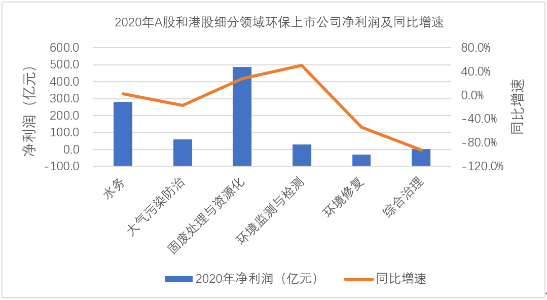 總體來看,2020年環(huán)保上市公司凈利潤總額高于上年,獲利表現(xiàn)優(yōu)于2019年,增幅超過A股平均水平。