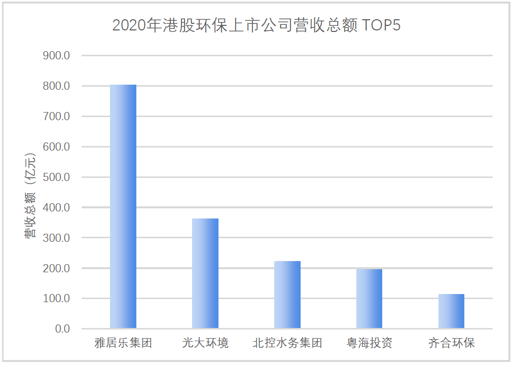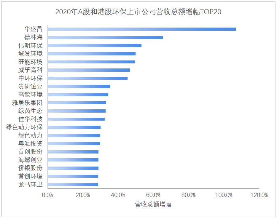 注: 數(shù)據(jù)來源于Wind數(shù)據(jù)庫,個(gè)別A股環(huán)保上市公司的環(huán)保營收難以準(zhǔn)確確定,實(shí)際情況以上市公司發(fā)布為準(zhǔn)。A股和港股環(huán)保上市公司營收總額方面:2020年179家環(huán)保上市公司共實(shí)現(xiàn)營收總額10717.4億元,同比增長7.6%,營收總額規(guī)模呈現(xiàn)擴(kuò)張態(tài)勢(shì)。其中,120家營收(占比67.0%)實(shí)現(xiàn)同比增長,最高增幅106.8%,59家(占比33.0%)營收同比下滑,最高跌幅-89.8%。其中,增幅最高的華盛昌,主要得益于防疫相關(guān)檢測設(shè)備銷售的增長;緊隨其后的德林海營收的快速增長主要得益于藍(lán)藻治理業(yè)務(wù)的增長;偉明環(huán)??偁I收整體增幅也超過50%,其垃圾焚燒設(shè)備、EPC及服務(wù)業(yè)務(wù)營收增長193.02%,垃圾清運(yùn)業(yè)務(wù)營收增長超過90%。