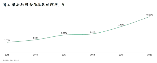 由于以上原因,我國餐廚垃圾回收并不完全。據(jù)統(tǒng)計,盡管餐廚垃圾合法收運處理率近5年持續(xù)上升,但目前也僅為10%左右(見圖4)。