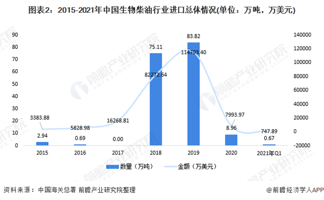 數(shù)據(jù)顯示,2015-2019年,我國生物柴油產(chǎn)品的進口數(shù)量和進口金額均總體增長。2019年,進口數(shù)量為83.82萬噸,進口金額為11.48億美元;2020年,進口數(shù)量和金額分別為8.96萬噸、7993.97萬美元。2021年一季度,我國生物柴油的進口量為0.67萬噸,進口金額為747.89萬美元。