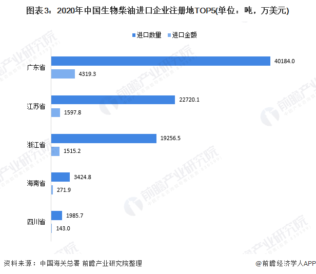 從行業(yè)進口企業(yè)注冊地來看,2020年,廣東省、江蘇省和浙江省是我國生物柴油產(chǎn)品進口量最大的地區(qū),一定程度上說明這三個省份對生物柴油的市場需求較大。其中,廣東省企業(yè)以4.02萬噸的進口量位列全國第一,進口金額達(dá)4319.3萬美元;排名第二的是江蘇省,該省企業(yè)共進口2.27萬噸生物柴油,進口金額為1597.8萬美元。
