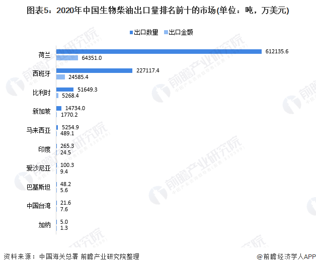 2020年,我國對荷蘭出口的生物柴油數(shù)量、金額最多,達(dá)61.21萬噸,出口金額為6.44億美元;其次是西班牙,我國對其出口22.71萬噸生物柴油,出口金額為2.46億美元;排名第三的是比利時,出口量達(dá)5.16萬噸,出口金額為5268.4萬美元。