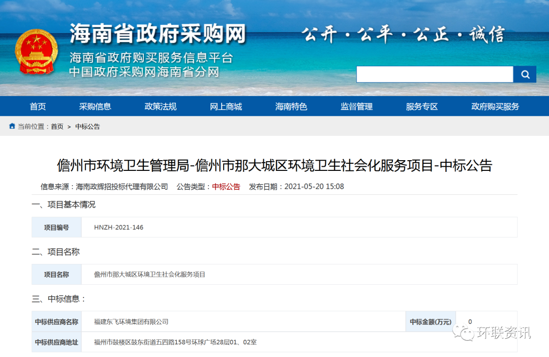 5月20日,儋州市環(huán)境衛(wèi)生管理局儋州市那大城區(qū)環(huán)境衛(wèi)生社會化服務(wù)項(xiàng)目開標(biāo)結(jié)果出爐,中標(biāo)供應(yīng)商為碧桂園生活服務(wù)集團(tuán)股份有限公司控股企業(yè)福建東飛環(huán)境集團(tuán)有限公司,成交金額約3.5億元/3年。