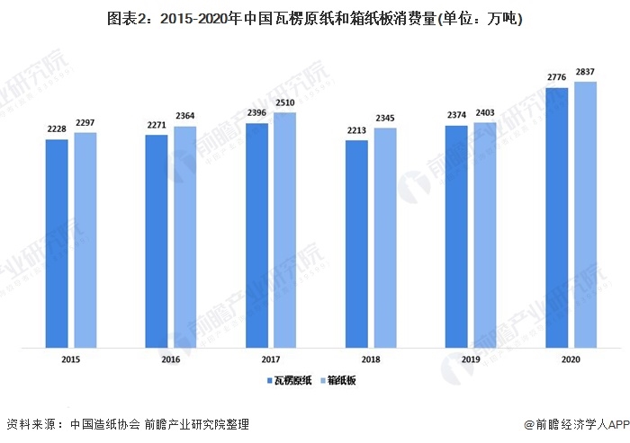 箱紙板和瓦楞紙板是中國紙類最主要的消費(fèi)類別,為廢紙回收行業(yè)提供了充足的市場空間。2020年我國箱紙板消費(fèi)量為2837萬噸,較2019年同比增長18.06%,占紙及紙板行業(yè)總消費(fèi)量的23.99%;瓦楞原紙消費(fèi)量2776萬噸,較2019年增長16.93%,占紙及紙板行業(yè)總消費(fèi)量的23.47%