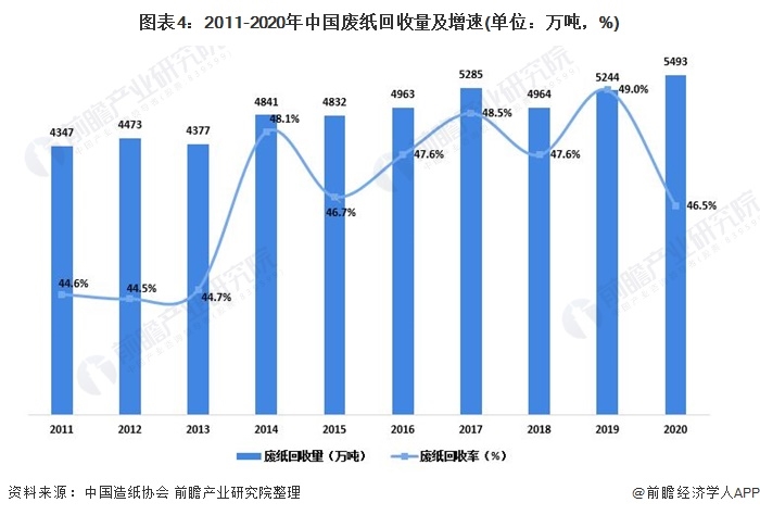 近年來,政府嚴(yán)格控制廢紙等固體廢物的進(jìn)口,為中國廢紙回收企業(yè)的發(fā)展提供了機(jī)會。2020年,中國回收廢紙總量5493萬噸,同比增長4.75%,廢紙回收率達(dá)到46.5%。