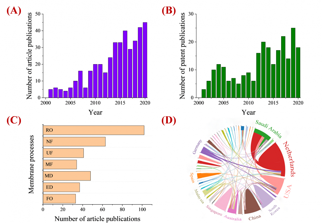 圖2 基于Web of Science獲取的主題為“ feed spacer”和“ membrane”、時(shí)間跨度為2001——2020年的文獻(xiàn)計(jì)量學(xué)結(jié)果。(A)每年相關(guān)文章發(fā)表情況;(B)每年相關(guān)專利授權(quán)情況;(C)發(fā)表文章中所涉及的膜工藝種類分布;(D)主要發(fā)文國(guó)家及其合作關(guān)系。