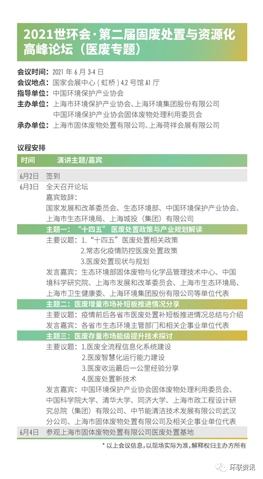 為持續(xù)完善醫(yī)療廢物處置機(jī)制、守好“末端”防線,助力全國醫(yī)療廢物處置補(bǔ)短板能力建設(shè),提升醫(yī)廢收運(yùn)處置能力與水平,推進(jìn)《醫(yī)療廢物處理處置污染控制標(biāo)準(zhǔn)》的貫徹實(shí)施,2021年6月2日-3日將在上海舉辦“2021世環(huán)會·第二屆固廢處置與資源化高峰論壇(醫(yī)廢專題)”。