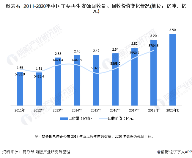 此外,根據(jù)工信部、商務(wù)部、科技部發(fā)布的《關(guān)于加快推進(jìn)再生資源產(chǎn)業(yè)發(fā)展的指導(dǎo)意見(jiàn)》中提出的發(fā)展目標(biāo),到2020年,全國(guó)再生資源回收利用量達(dá)到3.5億噸。