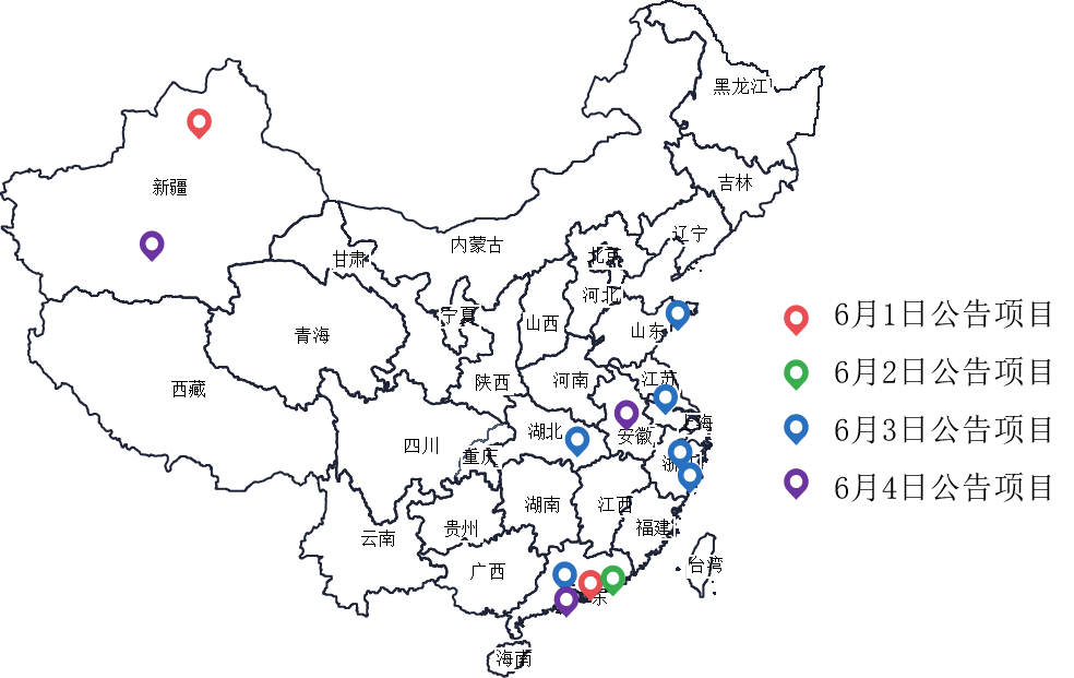6月份1日到4日監(jiān)測到的12個“城市管家項目”分布于廣東、湖北、江蘇、山東、新疆、浙江、安徽七省區(qū)。其中,區(qū)縣級“城市管家項目”5個, 鎮(zhèn)街級“城市管家項目”7個。