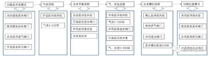 常規(guī)的濾池反沖洗是通過布置在濾料下方的反沖洗配氣配水廊道內(nèi)送入壓縮空氣和清水池的濾后水來進(jìn)行的,以采用彗星濾料的D型濾池來說,一般的流程是:1、切換反沖洗模式。2、氣洗流程。3、氣水洗流程。4、水洗加橫掃流程。5、切換過濾模式。詳細(xì)的操作流程見下圖。