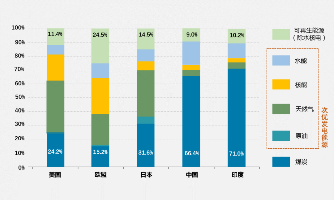 發(fā)電結(jié)構(gòu)(2019):中國(guó)以煤炭為主,發(fā)達(dá)經(jīng)濟(jì)體以次優(yōu)能源為主