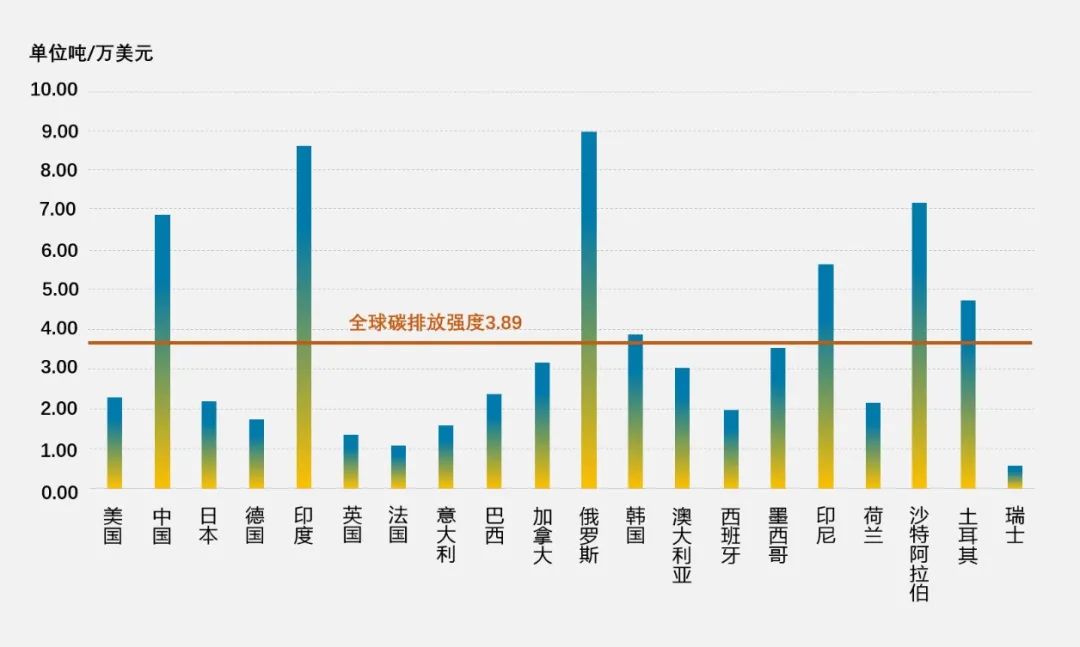 2019年全球GDP前20名國(guó)家的碳排放強(qiáng)度