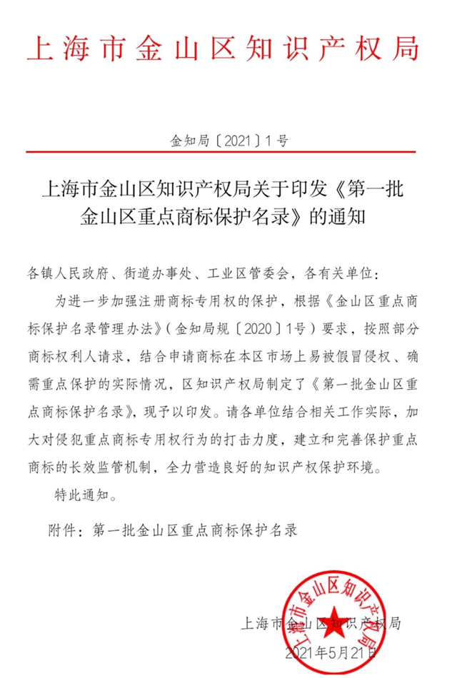 為進一步加強注冊商標專用權的保護,根據《上海市金山區(qū)重點商標保護名錄管理辦法》(金知局規(guī)〔2021〕1號)要求,上海市金山區(qū)知識產權局領導經過數(shù)月評審討論,結合申請商標在市場上易被假冒侵權、確需重點保護的實際情況,于近日頒布《第一批金山區(qū)重點商標保護名錄》,上海江浪科技股份有限公司成功入圍,企業(yè)實力再獲權威認證!
