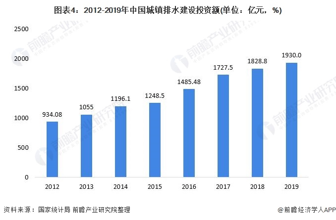 在《城市排水防澇設(shè)施建設(shè)中央預(yù)算內(nèi)投資專項(xiàng)管理暫行辦法》等排水投資政策的推動(dòng)下,我國水務(wù)投資持續(xù)加碼,自2013年起我國城鎮(zhèn)排水建設(shè)投資額每年快速增長,2012尚且為934.08億元,到2017年就已達(dá)到1727.52億元,增長了近一倍,2019年投資額達(dá)1930.02億元。