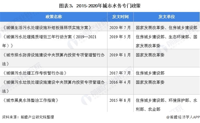 隨著城市用水人口的增長,我國城市水務(wù)面臨較大的供給壓力,因此國家十分注重城市水務(wù)的發(fā)展,近年來發(fā)布了一系列相關(guān)政策,特別是污水治理方面。其中《城鎮(zhèn)污水處理提質(zhì)增效三年行動(dòng)方案(2019—2021年)》指出,目標(biāo)經(jīng)過3年努力,地級(jí)及以上城市建成區(qū)基本無生活污水直排口,基本消除城中村、老舊城區(qū)和城鄉(xiāng)結(jié)合部生活污水收集處理設(shè)施空白區(qū),基本消除黑臭水體,城市生活污水集中收集效能顯著提高。