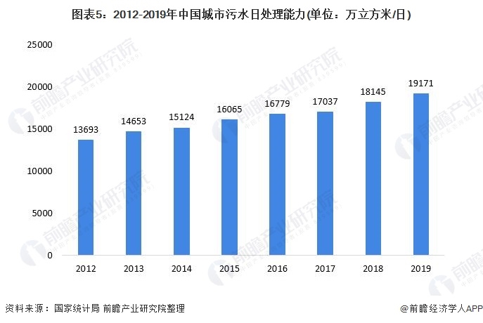 隨著國家政策的持續(xù)發(fā)力、水務(wù)投資的持續(xù)加碼,我國城市污水日處理能力逐步加強(qiáng),從2012年的13693萬立方米/日穩(wěn)步增長至2019年的19171萬立方米/日。