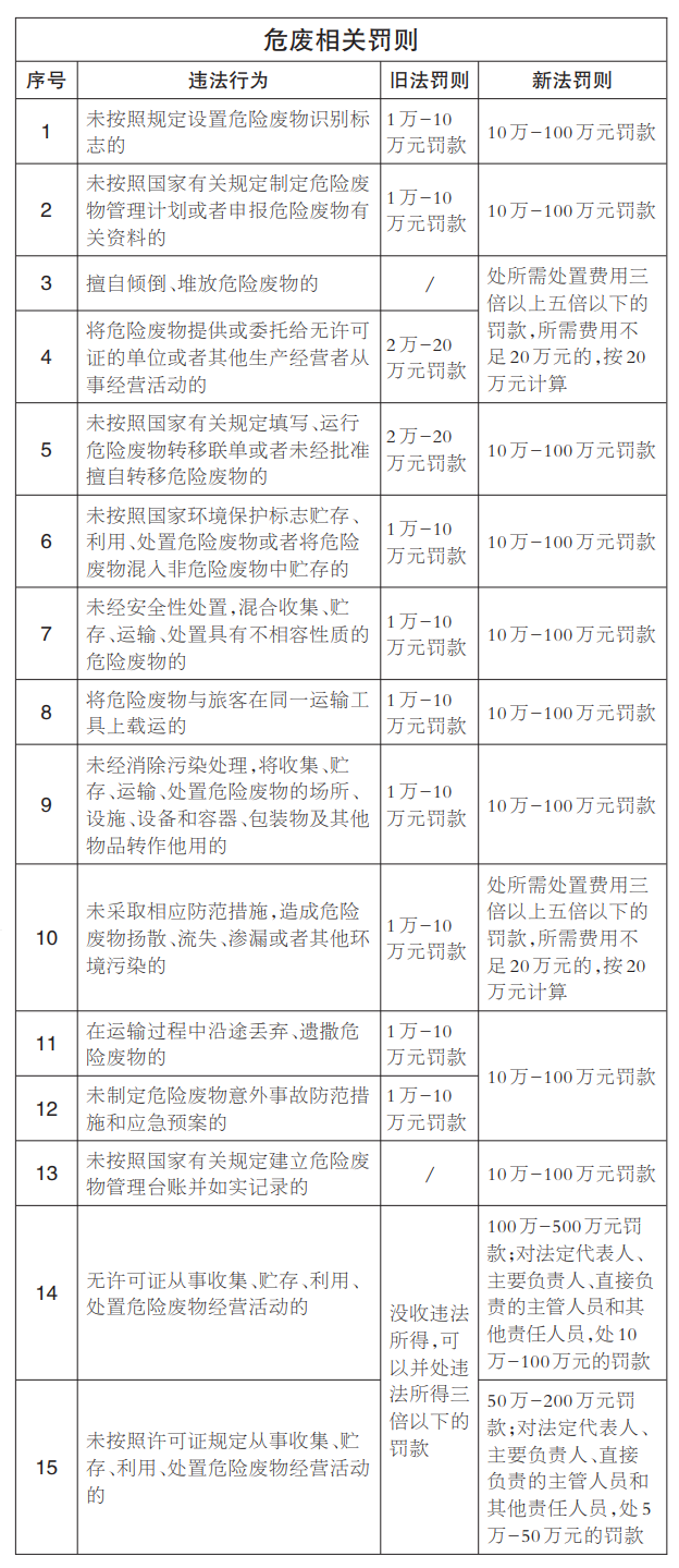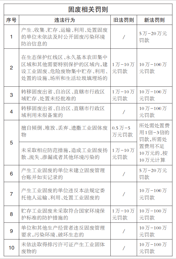 新固廢法在法律責(zé)任一章新增查封扣押、按日計(jì)罰、雙罰制等新執(zhí)法手段,既增加了處罰種類,又提高了罰款額度,為大大提高違法成本提供了法律依據(jù)。