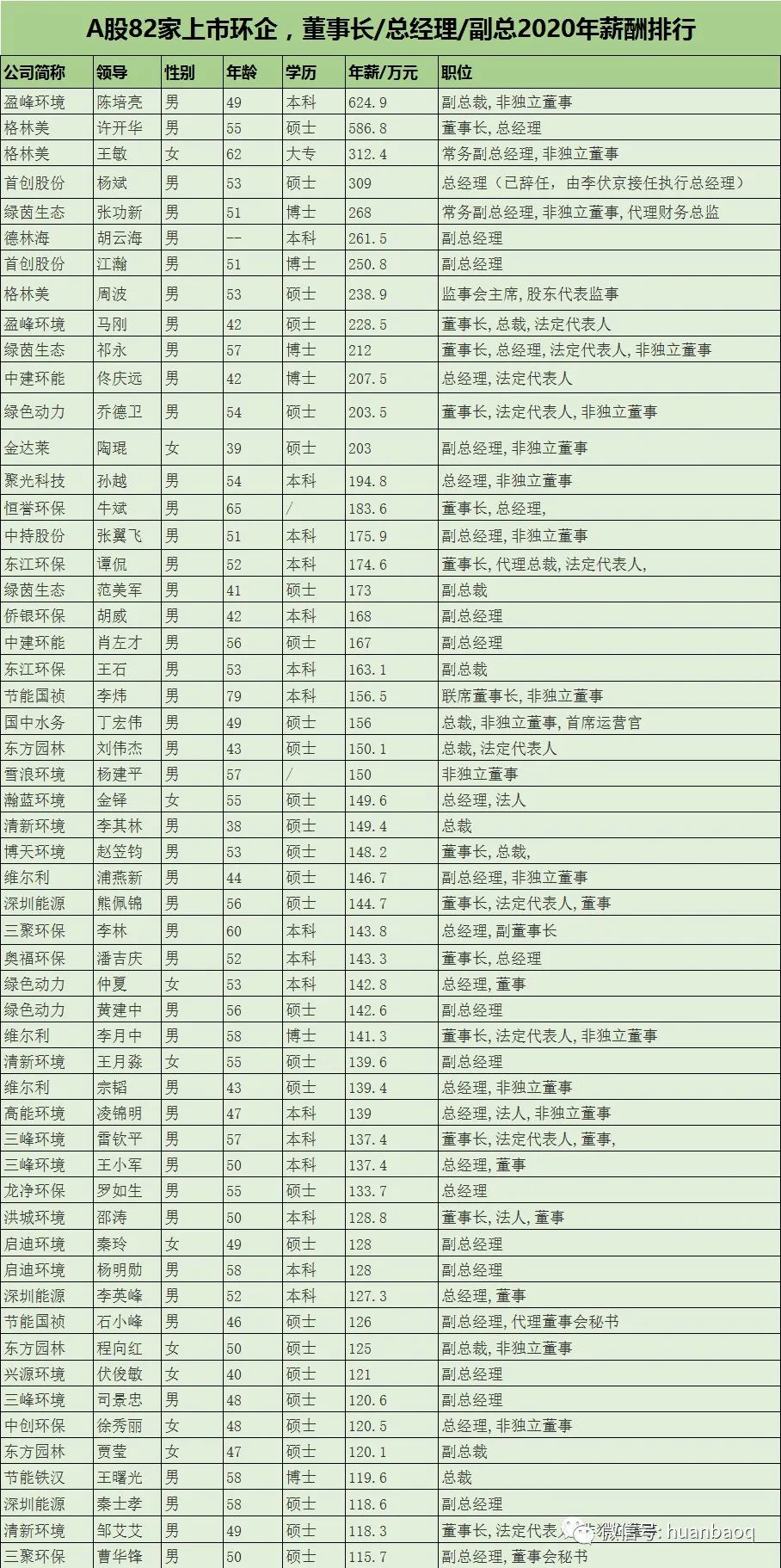 其中,有不少業(yè)內(nèi)熟知的大咖,如首創(chuàng)股份原總經(jīng)理?xiàng)畋螅晷?09萬(wàn)元)、瀚藍(lán)環(huán)境金鐸(年薪150萬(wàn)元)、高能環(huán)境凌錦明(年薪139萬(wàn)元)、三峰環(huán)境王小軍(年薪137.4萬(wàn)元),以及碧水源戴日成(年薪100萬(wàn)元)等。