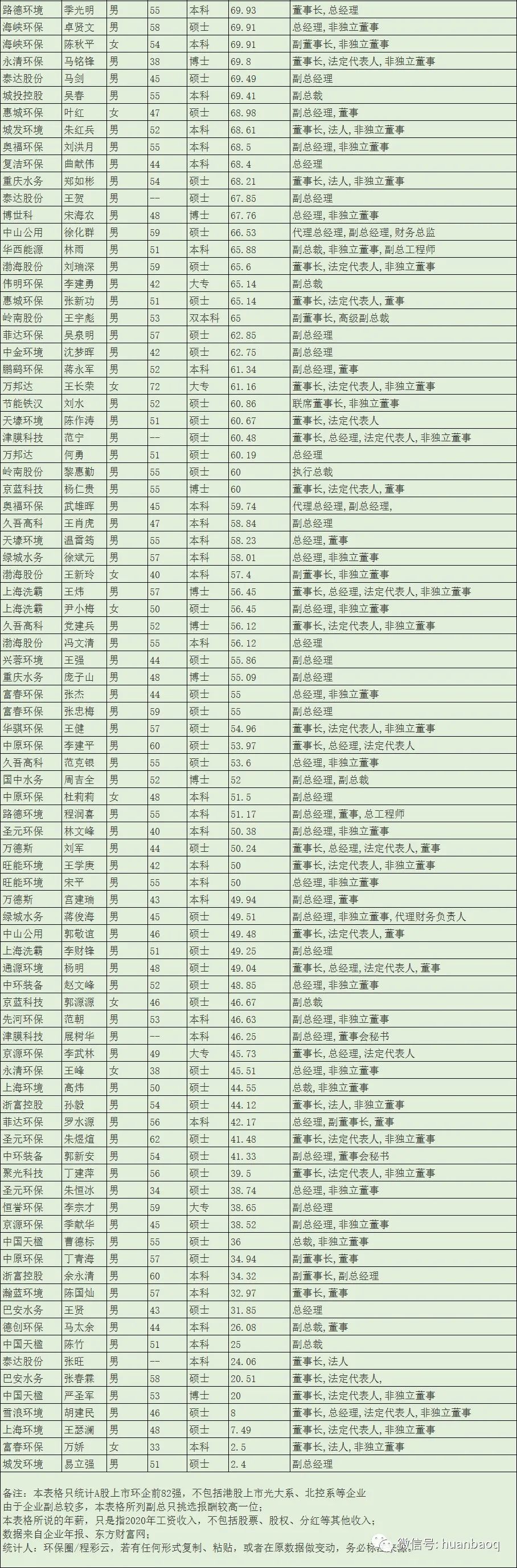 本文筆者費(fèi)時(shí)兩周,從各大證券網(wǎng)站和企業(yè)年報(bào)中詳細(xì)統(tǒng)計(jì)了國(guó)內(nèi)A股前82強(qiáng)上市環(huán)保企業(yè)董事長(zhǎng)、總經(jīng)理、副總經(jīng)理的年薪,從中發(fā)現(xiàn)了很多有意思的現(xiàn)象,與讀者分享。