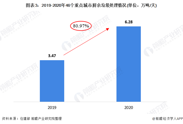 2020年12月4日,住建部召開新聞通氣會,就《進一步推進生活垃圾分類工作的若干意見》(以下簡稱《意見》)進行政策解讀。住建部介紹,我國46個重點城市廚余垃圾處理能力已從2019年的3.47萬噸/天,提升到6.28萬噸/天,年提升率為80.97%。
