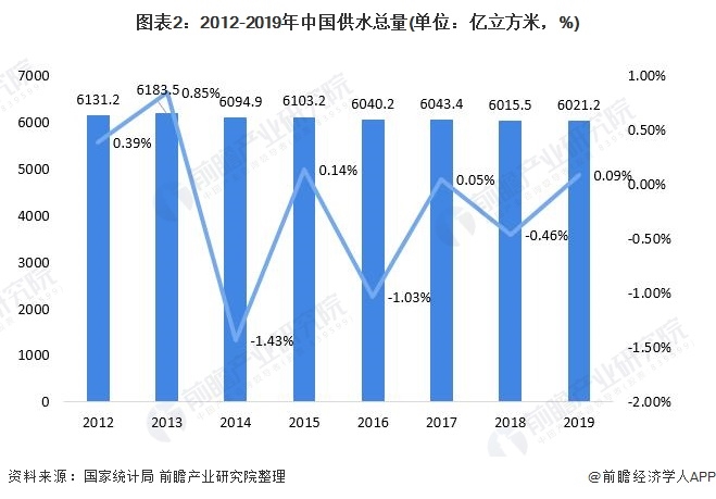 我國供水總量在2013年達到峰值后開始緩慢下降,近幾年,全國供水總量保持基本穩(wěn)定,平均年變化幅度保持在±1%左右。2019年我國供水總量為6021.2億立方米,同比增加0.09%,我國供水市場已趨近飽和,進入平穩(wěn)發(fā)展?fàn)顟B(tài)。