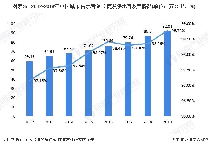 我國供水市場進入平穩(wěn)發(fā)展?fàn)顟B(tài)得益于近年來我國供水管道長度及供水普及率的逐年增長。2019年我國城市供水管道長度達92.01萬公里,供水普及率達98.78%。