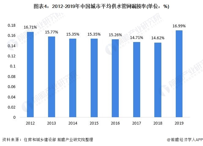 隨著我國供水管道長度的增長,我國供水管網(wǎng)漏損率也有所下降。2012-2018年,我國城市供水管網(wǎng)漏損率從16.71%下降至14.62%。2019年,我國供水管網(wǎng)漏損率小幅上升,增至16.99%。