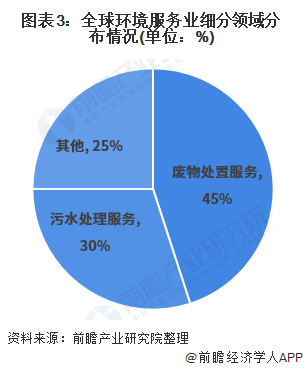 環(huán)境服務業(yè)各分項目發(fā)展很不平衡,廢物處置服務和污水處理服務占環(huán)境服務市場的主要份額。目前,這兩個項目產值占全球環(huán)境服務市場的75%,其中廢物處置服務占45%,污水處理服務占30%。