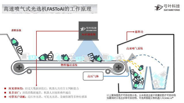 弓葉科技自主研發(fā)的智能垃圾分選裝備已實現(xiàn)落地應(yīng)用,目前參與了國內(nèi)多個垃圾處理項目,其中包含混合生活垃圾、可回收垃圾、廚余垃圾、餐廚垃圾、建筑垃圾等領(lǐng)域。同時,弓葉科技還將其剛推出的高速噴氣式光選機FASToAI運用到了醫(yī)療廢棄物處理領(lǐng)域中,幫助醫(yī)療機構(gòu)及醫(yī)廢處置單位降本增效,實現(xiàn)了對醫(yī)用級塑料垃圾的準確分選,同時大大降低了醫(yī)療工作人員垃圾分類的工作量與時間成本。