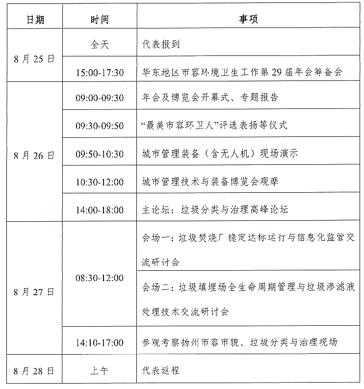 為貫徹習(xí)近平總書(shū)記關(guān)于垃圾分類、污染防治等重要指示批示精神,落實(shí)《“十四五”城鎮(zhèn)生活垃圾分類和處理設(shè)施發(fā)展規(guī)劃》文件要求,進(jìn)一步加強(qiáng)華東六省一市市容環(huán)衛(wèi)行業(yè)單位的互動(dòng)交流,推進(jìn)地區(qū)市容環(huán)衛(wèi)行業(yè)可持續(xù)發(fā)展,經(jīng)研究決定,于2021年8月25日-27日,在江蘇省揚(yáng)州市召開(kāi)華東地區(qū)市容環(huán)境衛(wèi)生工作第29屆年會(huì)暨第24屆廢棄物處理研討會(huì),并同步舉辦2021年城市管理技術(shù)與裝備博覽會(huì)?,F(xiàn)將有關(guān)事項(xiàng)通知如下: