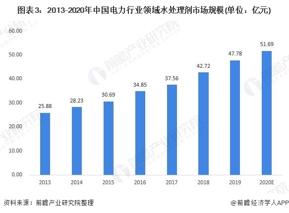 目前,我國(guó)火力發(fā)電廠的廢水主要分為工業(yè)廢水、沖灰水和生活污水,其廢水處理方式也有所不同。2019年,我國(guó)電力行業(yè)水處理劑市場(chǎng)規(guī)模占總水處理劑市場(chǎng)規(guī)模的15.11%,初步測(cè)算,2020年我國(guó)電力行業(yè)水處理劑市場(chǎng)規(guī)模約為51.69億元。