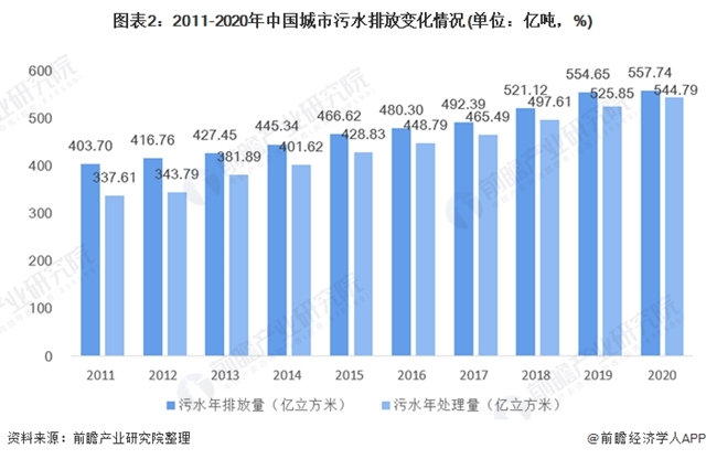 2011年我國城市污水排放量為304.7億立方米,同年污水年處理量為337.61億立方米,未處理的廢水量達到66億立方米左右,而到了2020年,據(jù)前瞻初步估計,我國城市污水排放量約為557.74億立方米,污水年處理量約為544.79億立方米,未處理的廢水量約為13億立方米,相較于2011年減少53億立方米。