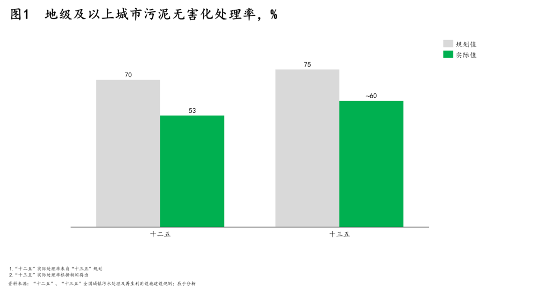 在此背景下,各級(jí)政府最終選擇先將污泥處理放一放,將有限資金優(yōu)先用于污水處理設(shè)施和管網(wǎng)建設(shè),這導(dǎo)致國內(nèi)“重水輕泥”的傾向明顯,“十二五”和“十三五”規(guī)劃中的地級(jí)及以上城市污泥無害化處理率目標(biāo)兩次落空也就見怪不怪了(見圖1)。