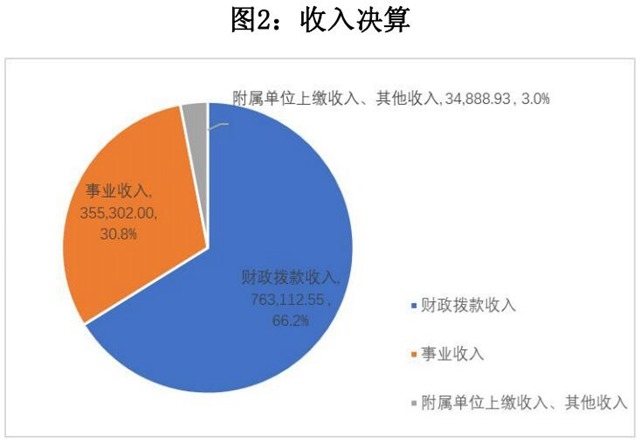 本年收入合計1,153,303.49萬元,其中:財政撥款收入 763,112.55萬元,占66.2%;事業(yè)收入355,302萬元,占30.8%;附 屬單位上繳收入130萬元,其他收入34,758.93萬元,兩項合計占 3%。
