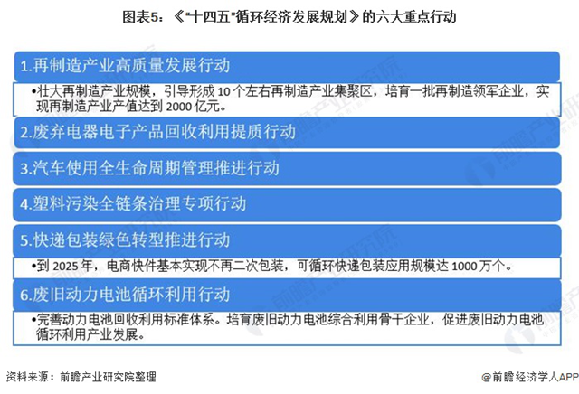 《規(guī)劃》還提出了重點(diǎn)工程與行動(dòng),共有五大重點(diǎn)工程和六大重點(diǎn)行動(dòng)。五大重點(diǎn)工程分別為城市廢舊物資循環(huán)利用體系建設(shè)工程、園區(qū)循環(huán)化發(fā)展工程、大宗固廢綜合利用示范工程、建筑垃圾資源化利用示范工程和循環(huán)經(jīng)濟(jì)關(guān)鍵技術(shù)與裝備創(chuàng)新工程。
