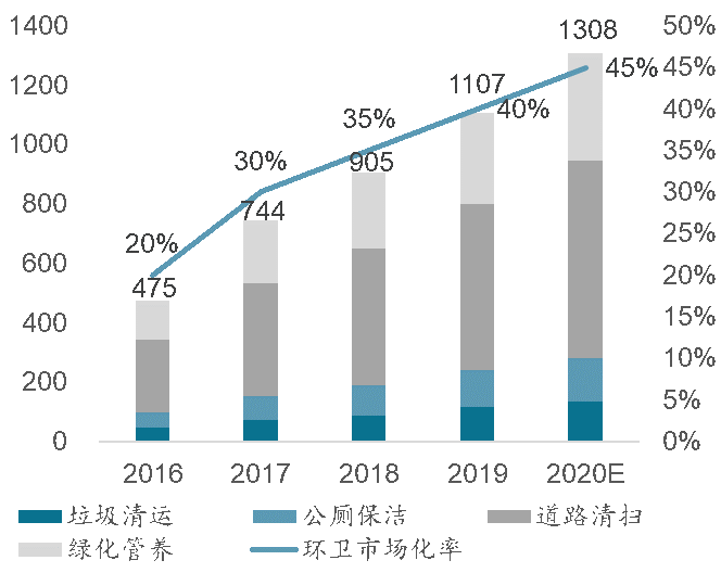 圖表1 2016-2020年全國(guó)環(huán)衛(wèi)市場(chǎng)化空間規(guī)模及市場(chǎng)化率測(cè)算