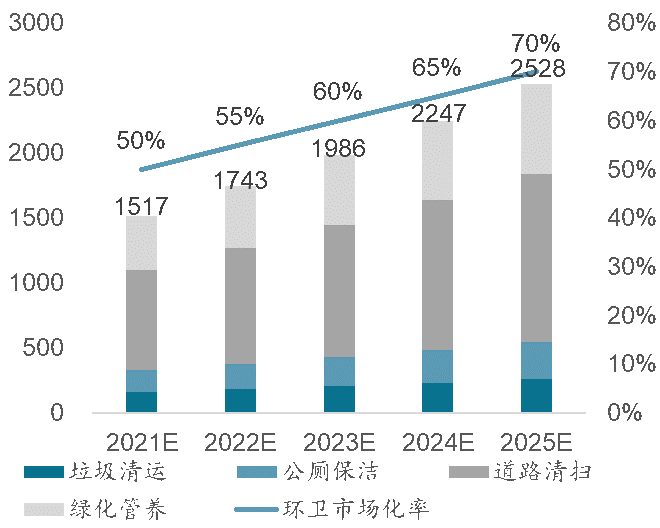 圖表3 2021-2025年全國(guó)環(huán)衛(wèi)市場(chǎng)化空間規(guī)模及市場(chǎng)化率預(yù)測(cè)