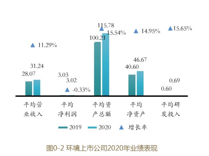 2020年,環(huán)境上市公司182家(涵蓋以節(jié)能環(huán)保及生態(tài)治理相關(guān)業(yè)務(wù)為主業(yè)的上市公司,包含滬深主板、創(chuàng)業(yè)板、科創(chuàng)板及香港主板、新加坡主板上市公司),平均營業(yè)收入31.24億元,同比增長8.85%;平均凈利潤3.02億元,同比下降0.30%;平均凈利潤率9.67%,同比下降0.89%;平均資產(chǎn)總額115.78億元,同比增長15.54%;平均資產(chǎn)負(fù)債率59.69%,同比增長0.20個百分點(diǎn);平均凈資產(chǎn)收益率(ROE)6.47%,同比下降0.99個百分點(diǎn);平均研發(fā)投入強(qiáng)度2.20%,同比增加0.13個百分點(diǎn)。