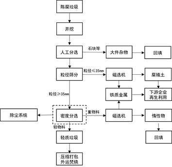 項(xiàng)目篩分系統(tǒng)工藝流程為“人工分揀—粒徑篩分—密度分選—雙磁選”,設(shè)計(jì)處理能力500t/d,于2019年投入使用。人工分揀主要是分離石塊、木板等大件雜物;粒徑篩分主要是用滾筒篩分離粒徑小于35mm的腐殖土,腐殖土經(jīng)磁選去除鐵質(zhì)金屬后資源化利用;粒徑大于35mm的篩上物進(jìn)入密度分選系統(tǒng)分離輕質(zhì)垃圾和重質(zhì)垃圾,輕質(zhì)垃圾主要是塑料和紡織物等,經(jīng)壓縮打包送入焚燒發(fā)電廠處置,重物質(zhì)主要是磚瓦等惰性物質(zhì),經(jīng)磁選系統(tǒng)選出鐵質(zhì)金屬后回填;項(xiàng)目分選出的鐵質(zhì)金屬由下游回收企業(yè)再生利用。