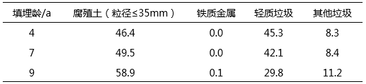 分別從距離表層0.5~1.0m、3.0~3.5m和5.0~5.5m的垃圾層提取各1.0t(濕基)垃圾,作為填埋齡4a、7a和9a的陳腐垃圾樣品。用于重金屬含量測(cè)定的樣品,從滾筒篩篩下物(粒徑≤35mm)中采集,樣品重約5Kg,呈深灰色,含水率20.7%。