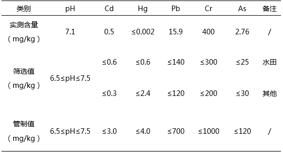 主要檢測(cè)腐殖土中Cd、Hg、Pb、Cr、As 五種重金屬的含量,并與《土壤環(huán)境質(zhì)量 農(nóng)用地土壤污染風(fēng)險(xiǎn)管控標(biāo)準(zhǔn)(試行)》(GB 15618-2018)中對(duì)農(nóng)用地土壤污染風(fēng)險(xiǎn)篩選值和管制值的進(jìn)行對(duì)比,結(jié)果如表3所示: