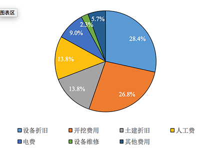 開(kāi)挖費(fèi)用主要是挖掘設(shè)備的租賃費(fèi)和油耗費(fèi)用;檢修費(fèi)用主要是日常維修費(fèi)、計(jì)量?jī)x表校驗(yàn)費(fèi)等;其他費(fèi)用主要是一些不可預(yù)見(jiàn)費(fèi)用的支出等。核算成本過(guò)程中,電費(fèi)和其他費(fèi)用按陳腐垃圾總量均攤,設(shè)備折舊按6年均攤,人工費(fèi)用按10名工人核算。具體運(yùn)行成本組成如圖2所示,其中,設(shè)備折舊費(fèi)占比28.4%,是運(yùn)行成本中最主要的費(fèi)用組成;其次為開(kāi)挖費(fèi)用占比26.8%。