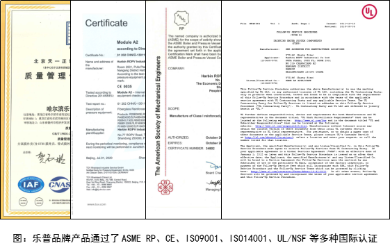 接下來的幾年,除通過ASME RP認證外,樂普認證部門和研發(fā)部門牽頭,與其他部門共同持續(xù)發(fā)力,樂普企業(yè)及產品先后通過了ISO9001、CE、UL(NSF 61)、CNAS、ACS、WRAS等認證,并建立了GB/T19001、GB/T24001、GB/T28001一體化管理體系,成為了國內膜外殼行業(yè)中更多被第三方機構認可的品牌,也為樂普的國際化發(fā)展鋪設了道路。