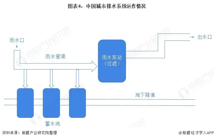 城市內(nèi)澇治理與完善城市排水系統(tǒng)密不可分。從城市排水系統(tǒng)運作情況來看,首先,雨水會順著雨水口進入雨水管渠,接著在雨水泵站過濾后,通過出水口流向湖泊或直接用于綠化澆灌等。如果遇到特大暴雨,管道也無法承載時,雨水會進一步分流至管道下方的隧道中,在降雨結束后送往污水處理廠進行再次利用或排出到湖泊河流和人工水體中。
