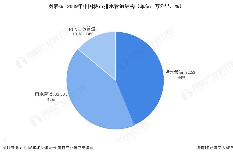 從我國城市排水系統(tǒng)的發(fā)展現(xiàn)狀來看,近年來,我國城市排水管道長度持續(xù)增長。2019年,全國城市排水管道增加至74.40萬公里,同比增長8.85%。其中,污水管道和雨水管道分別為32.52和31.50萬公里,占比為44%和42%;雨污合流管道為10.38萬公里,占比為14%。
