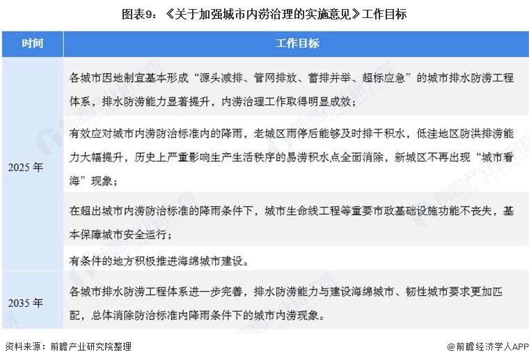 在工作目標方面,提出了2025年,各城市因地制宜基本形成“源頭減排、管網(wǎng)排放、蓄排并舉、超標應急”的城市排水防澇工程體系;2035年總體消除防治標準內(nèi)降雨條件下的城市內(nèi)澇現(xiàn)象。