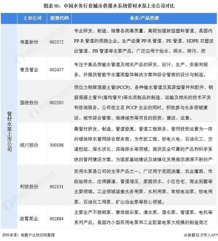 目前我國供排水管材水泵上市企業(yè)主要有偉星新材、青龍管業(yè)等管材上市公司;國統(tǒng)股份、納川股份等集管材和供排水建設的上市公司;利歐股份、凌霄泵業(yè)等水泵上市公司。其中,偉星新材是國內(nèi)PP-R管道的重點企業(yè)之一;利歐股份是中國在大分微型小型水泵制造商和出口商,先后為國內(nèi)五大發(fā)電公司、武漢鋼鐵、中國水利電力、中國寰球、中國石化、中國石油、南水北調工程淮河治理工程、引黃濟青工程、引灤入津工程、蘇丹尼羅河泵站、印度尼西亞南望熱電廠等服務。