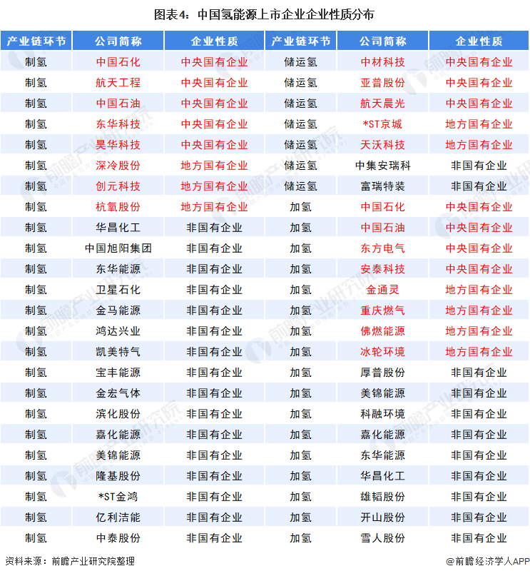 從中可以發(fā)現(xiàn),頭部企業(yè)多數(shù)屬于中央及地方國有企業(yè)。從國內(nèi)氫能源上市企業(yè)的性質(zhì)來看,氫能源領(lǐng)域中國有上市企業(yè)不在少數(shù),其中有多個屬于中央國有企業(yè)。