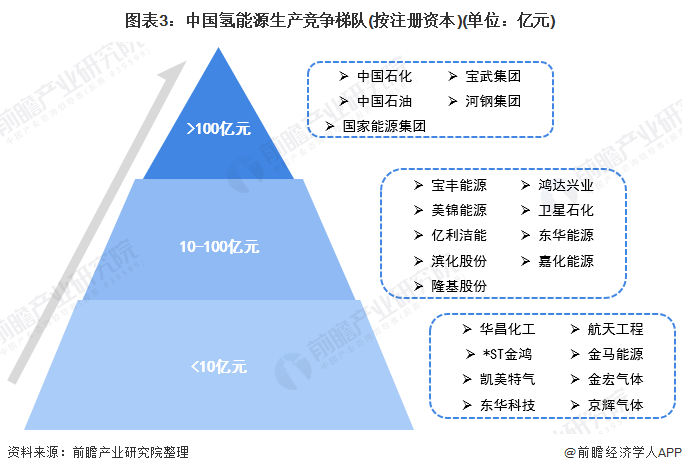 氫能源生產(chǎn)領(lǐng)域依據(jù)企業(yè)的注冊資本劃分,可分為3個競爭梯隊(duì)。其中,注冊資本大于100億元的企業(yè)有中國石油、國家能源集團(tuán)、中國石化、寶武集團(tuán)、河鋼集團(tuán);注冊資本在10-100億元之間的企業(yè)有:寶豐能源、美錦能源、隆基股份、鴻達(dá)興業(yè)、億利潔能等;華昌化工、凱美特氣、東華科技、航天工程、金馬能源等企業(yè)的注冊資本在10億元以下。